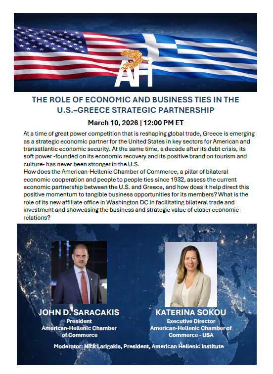 “I would like to commend AHI for its key role in strengthening relationships between the U.S. and some of our closest allies. For decades, the Institute has been a leading voice in Washington on Greek-American and Cypriot-American relations and I am confident that you will continue this valuable work as our nations' partnership enters its third century”