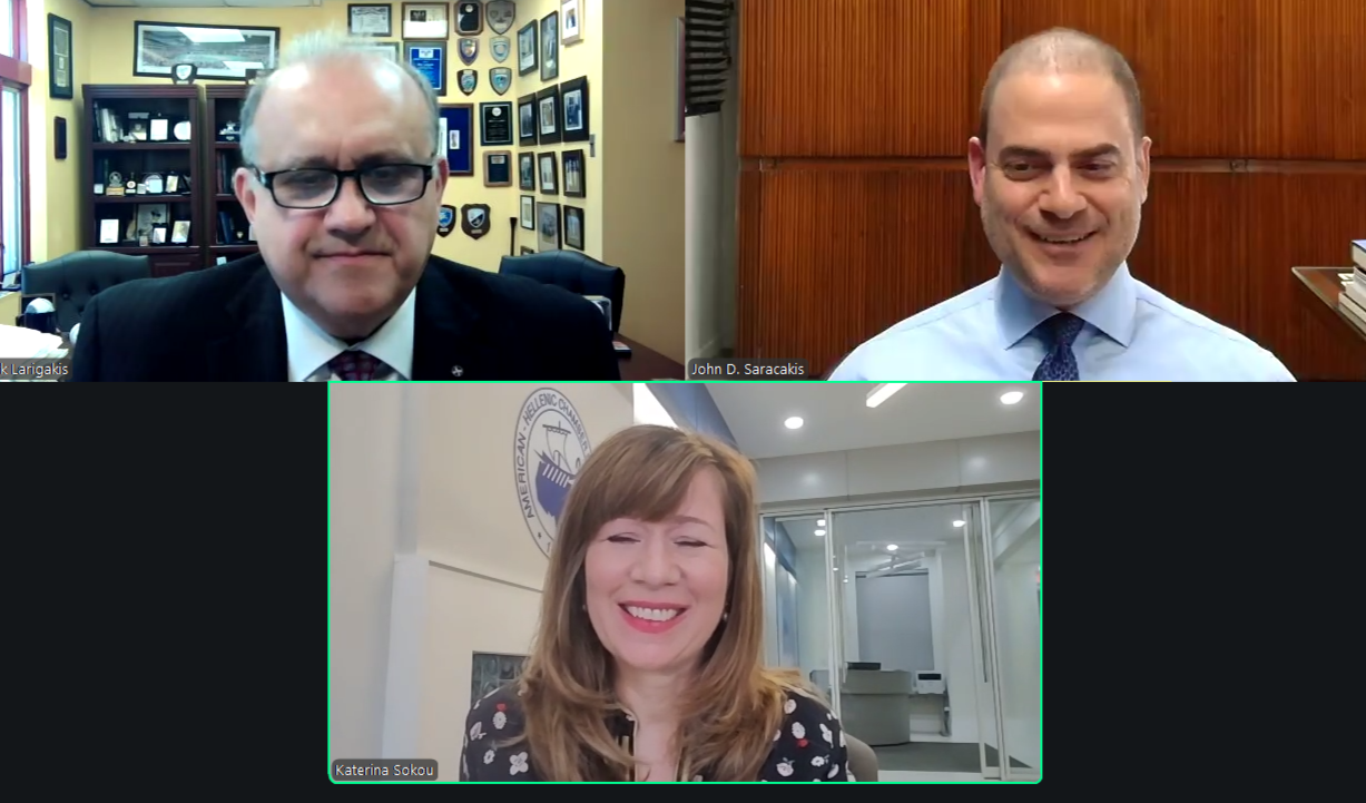 Nick Larigakis, president and CEO of AHI, moderated the discussion with John D. Saracakis, president of the American-Hellenic Chamber of Commerce, and Katerina Sokou, executive director of the American-Hellenic Chamber of Commerce USA